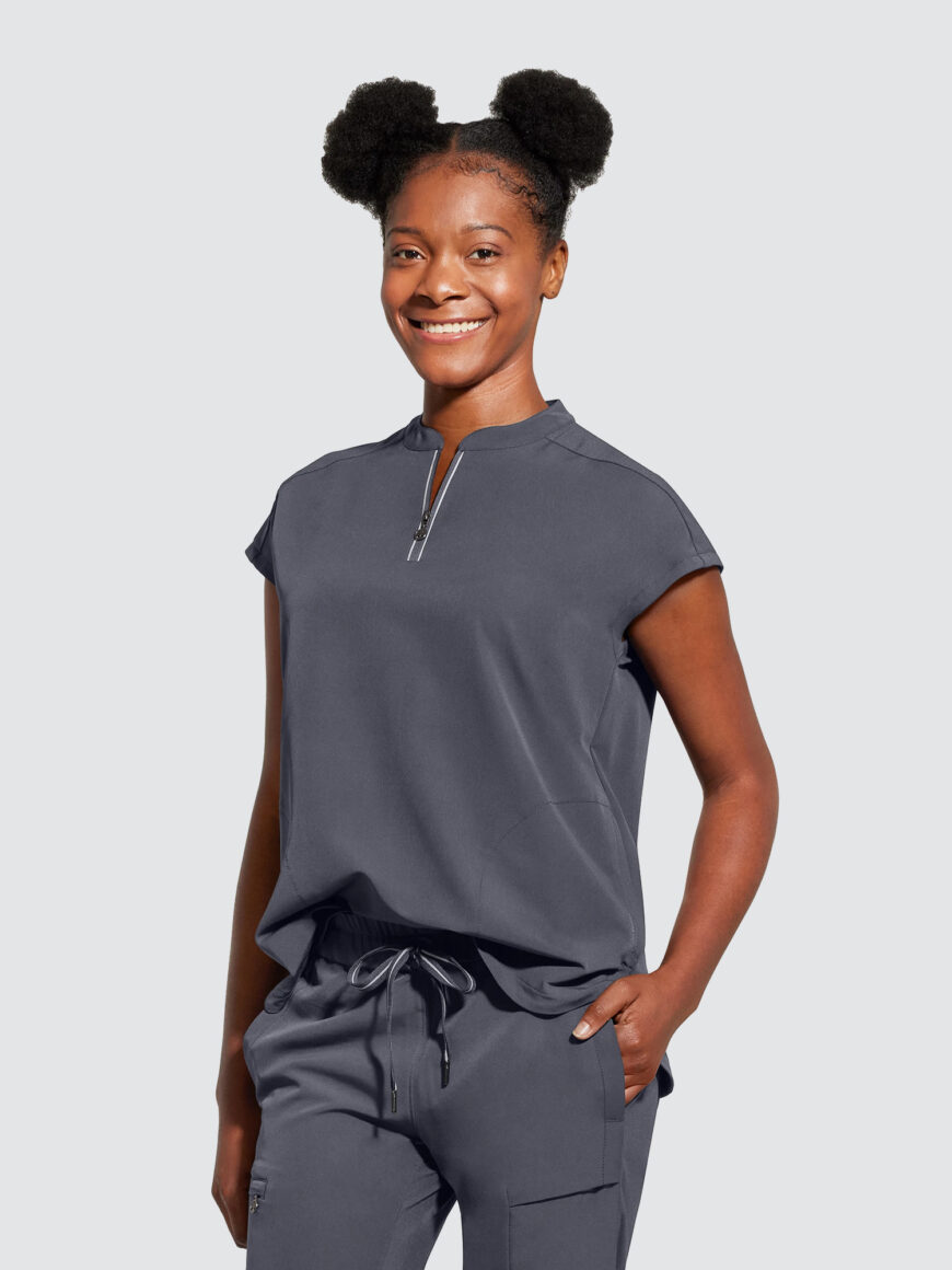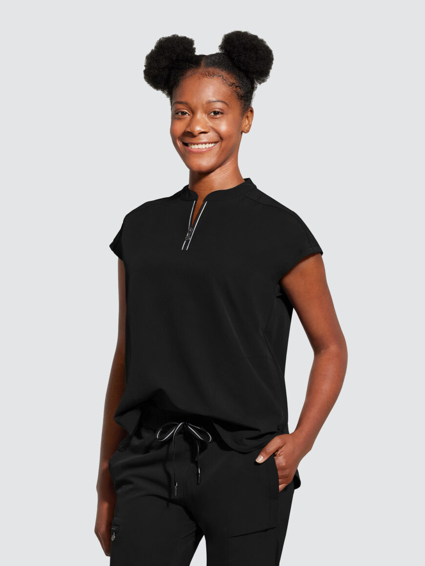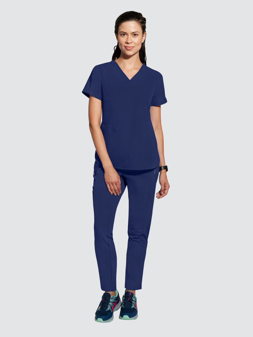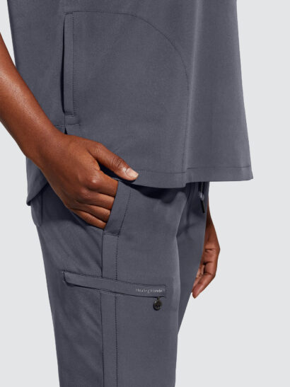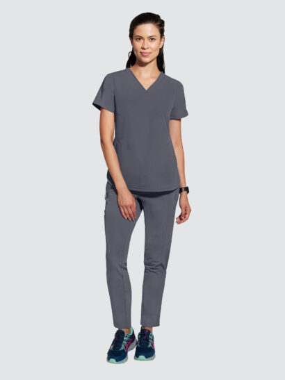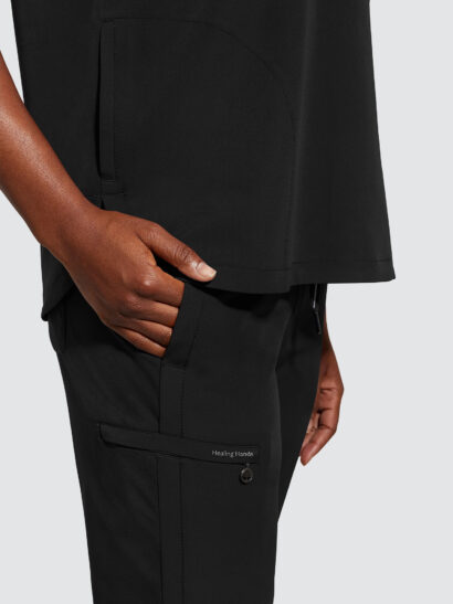 An essential uniform piece that will never go out of style. The Healing Hands Sandy V-Neck Tunic & Niko Trousers mixed-media fabrication features both knit and woven fabrics with a mandarin collar, boxy fit and dolman sleeves for a flattering silhouette, alongside a true 360 trouser that hugs your curves in all the right places, the narrow leg opening and mixed-media fabrication are flattering on any body type and from every angle.