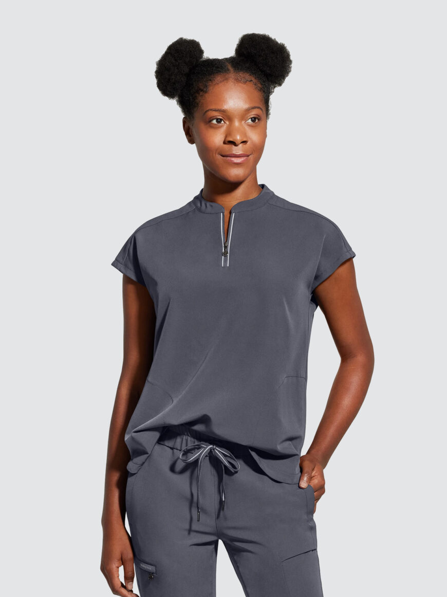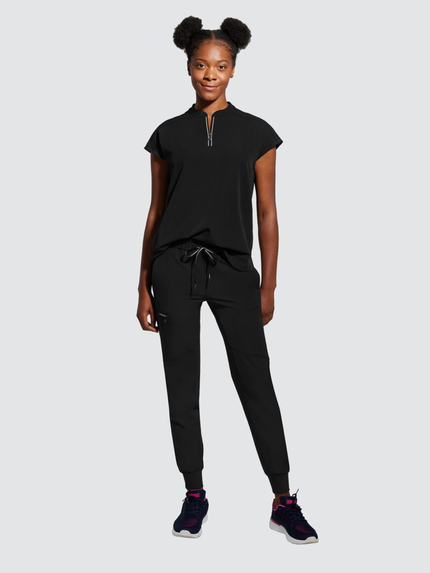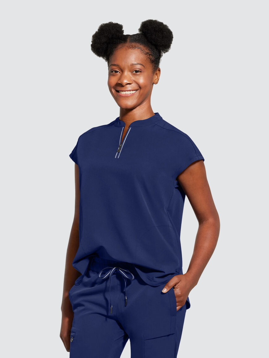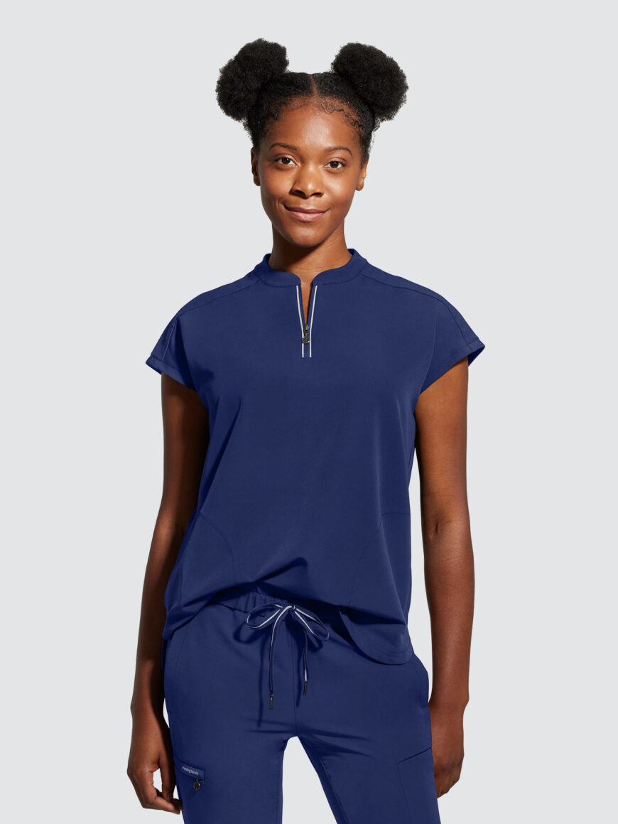 An essential uniform piece that will never go out of style. The Healing Hands Sandy V-Neck Tunic & Niko Trousers mixed-media fabrication features both knit and woven fabrics with a mandarin collar, boxy fit and dolman sleeves for a flattering silhouette, alongside a true 360 trouser that hugs your curves in all the right places, the narrow leg opening and mixed-media fabrication are flattering on any body type and from every angle.