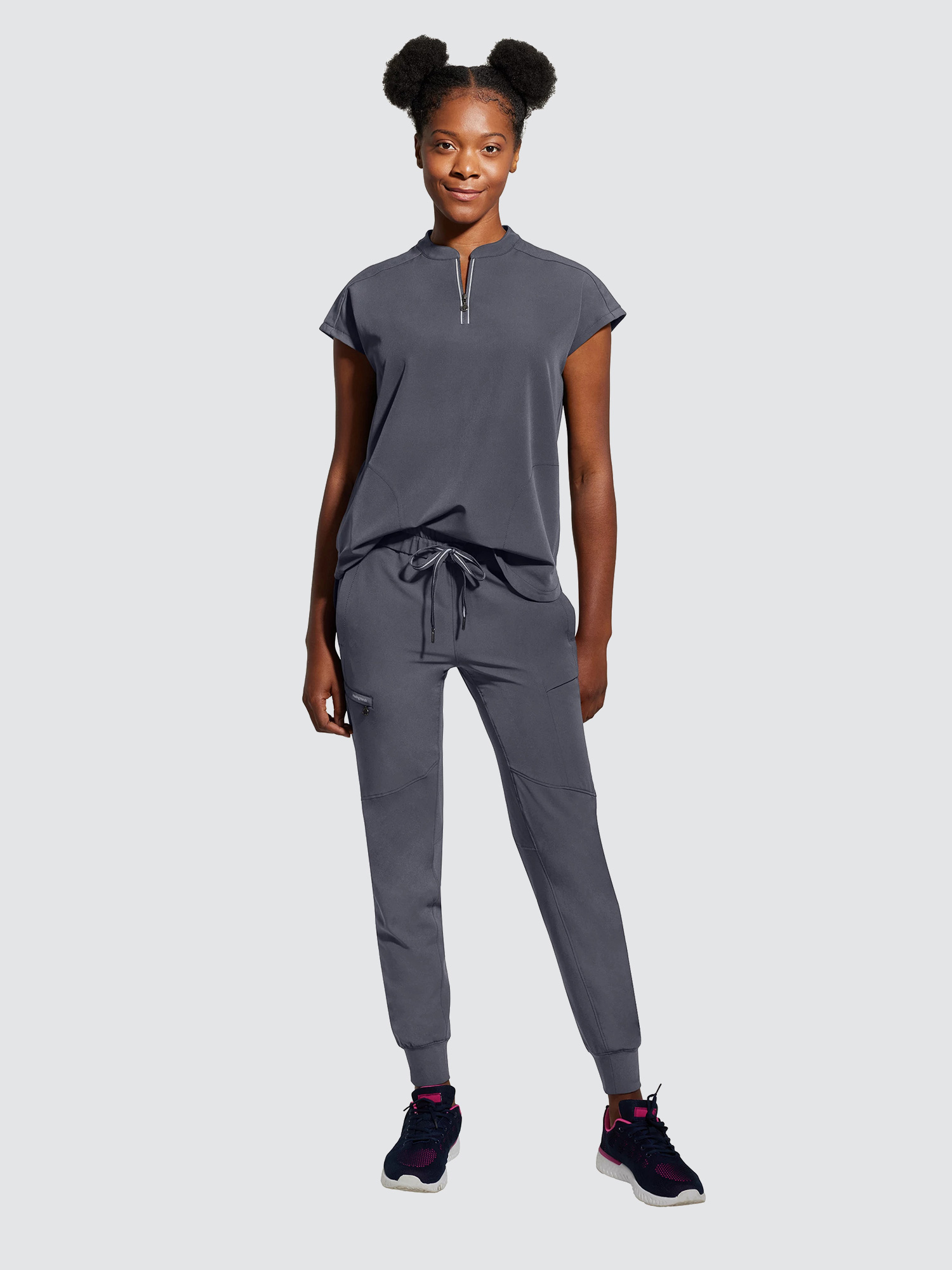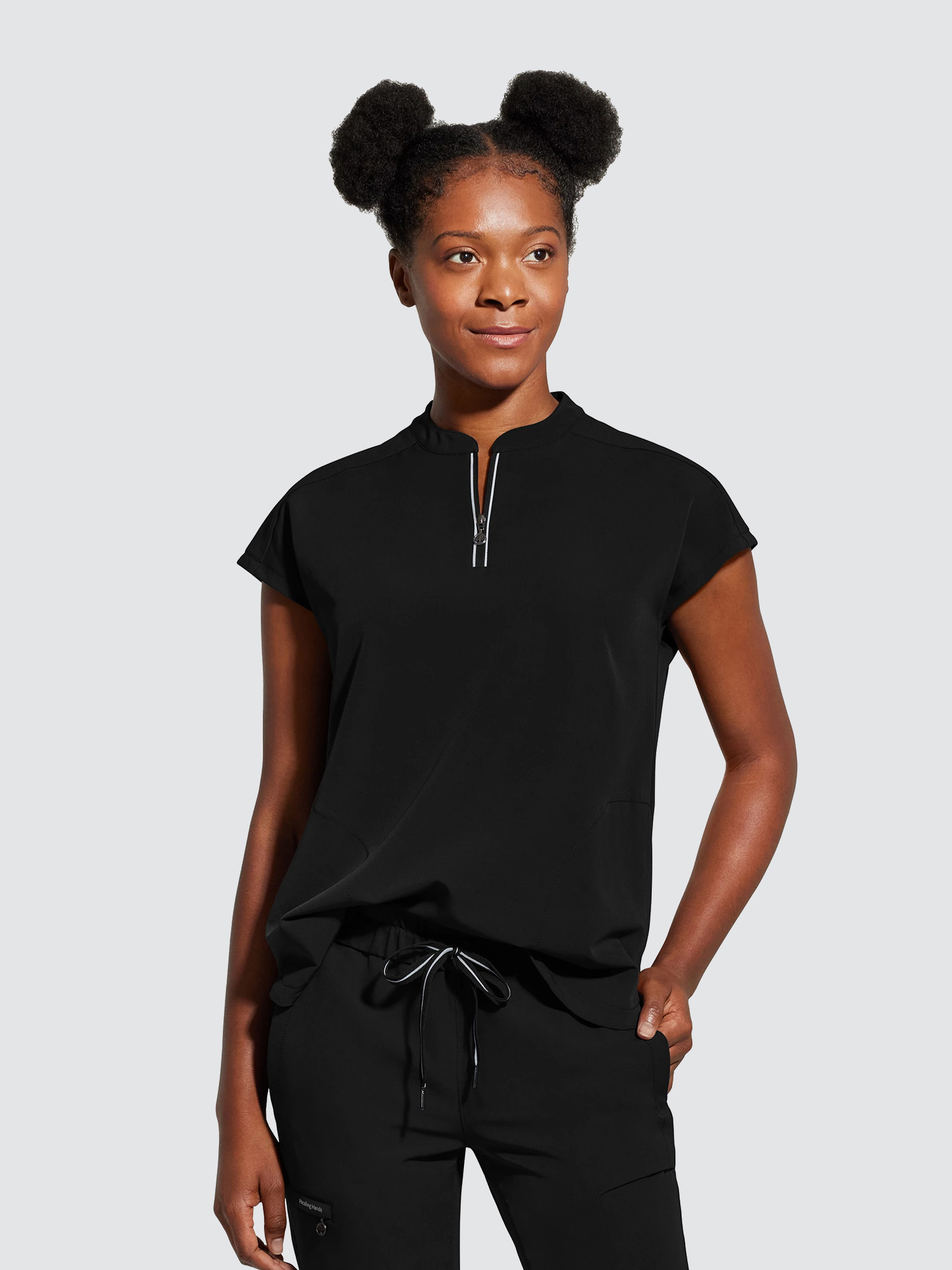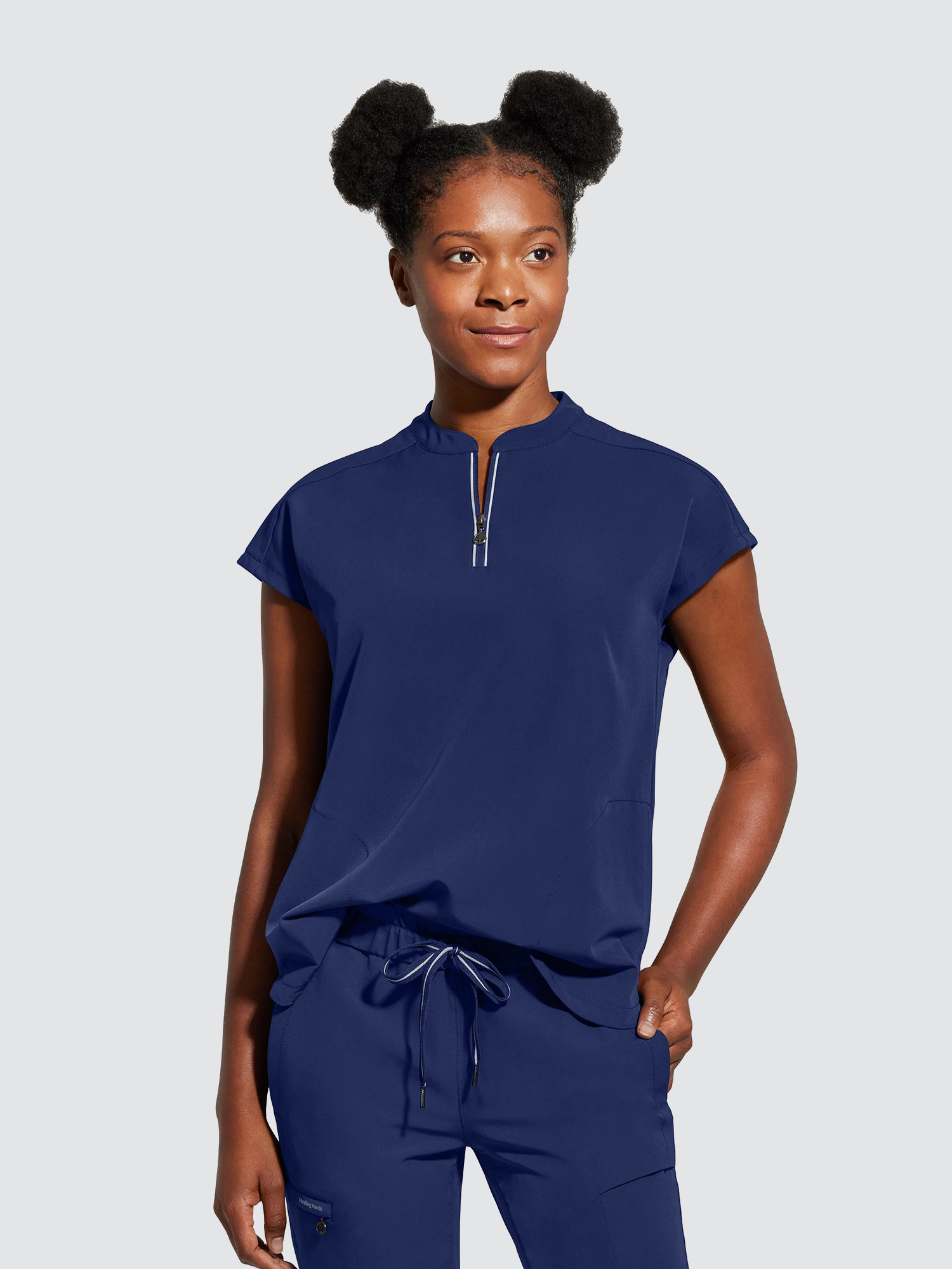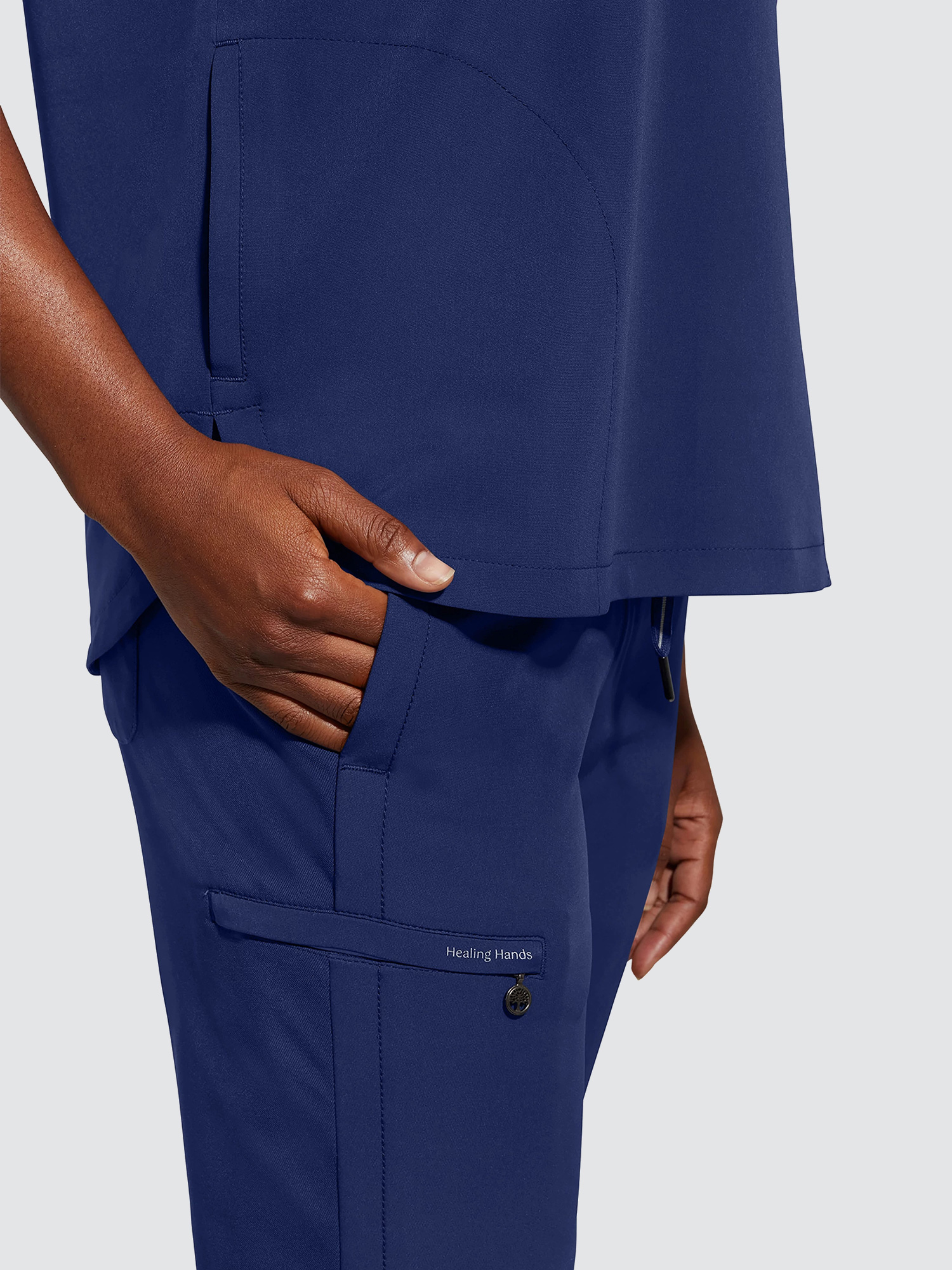 An essential uniform piece that will never go out of style. The Healing Hands Sandy V-Neck Tunic & Niko Trousers mixed-media fabrication features both knit and woven fabrics with a mandarin collar, boxy fit and dolman sleeves for a flattering silhouette, alongside a true 360 trouser that hugs your curves in all the right places, the narrow leg opening and mixed-media fabrication are flattering on any body type and from every angle.