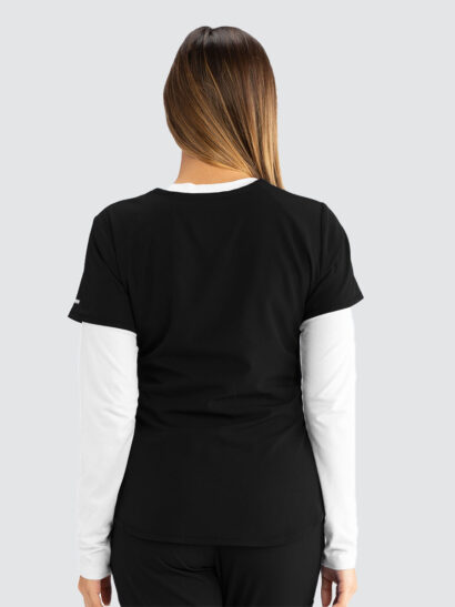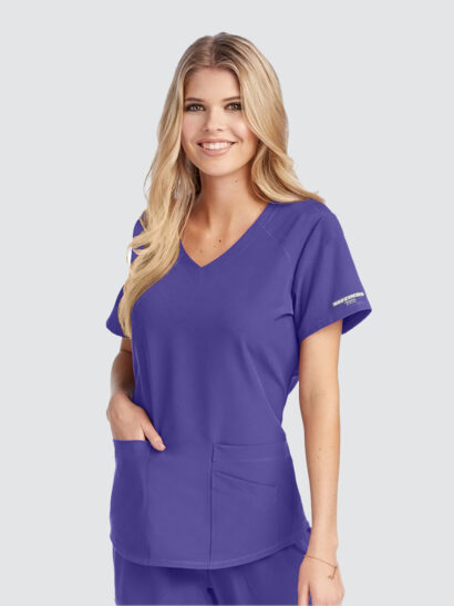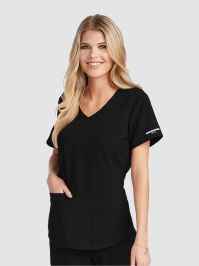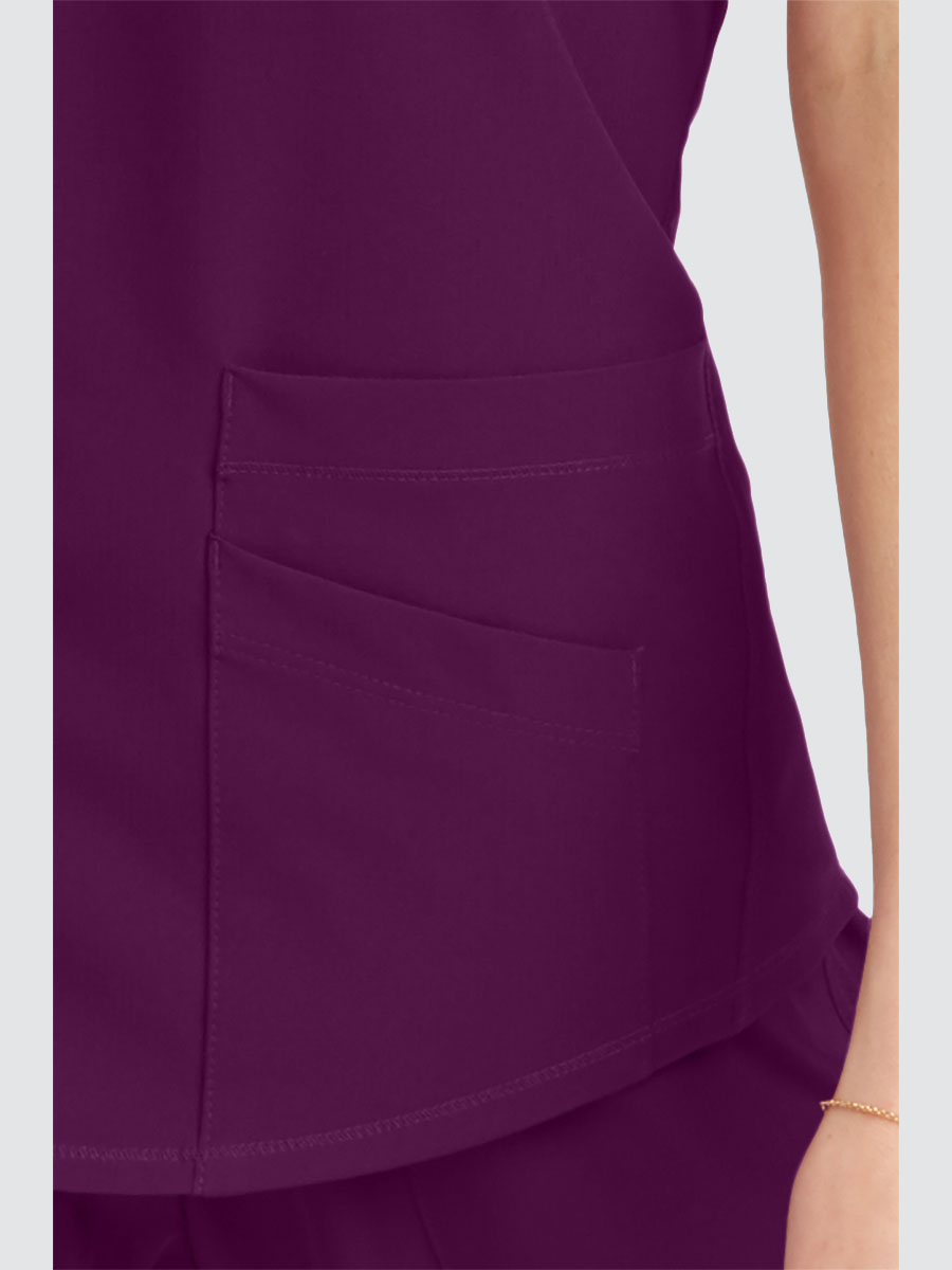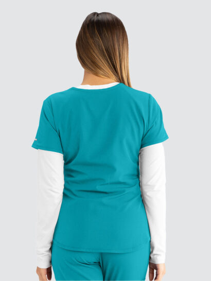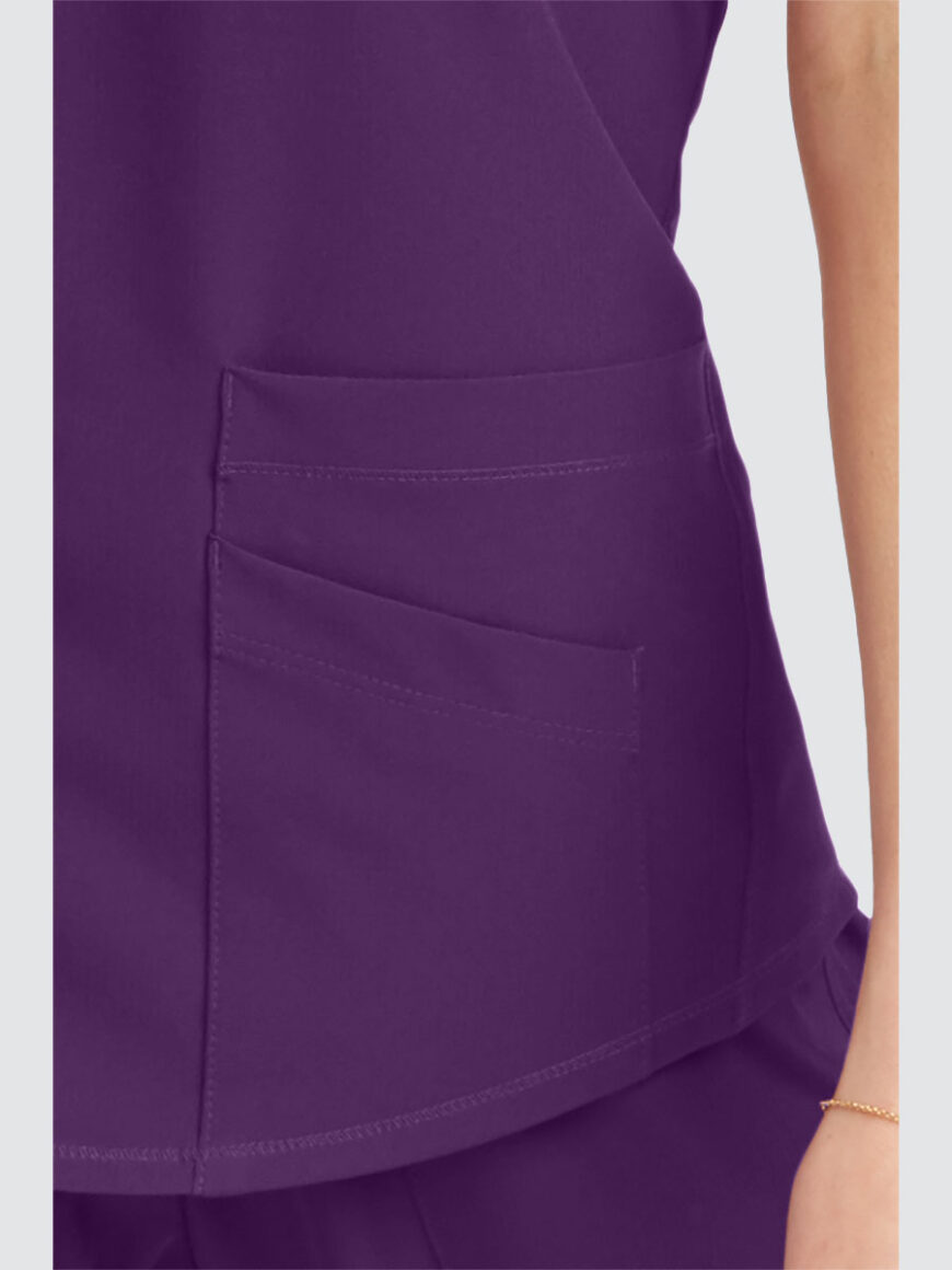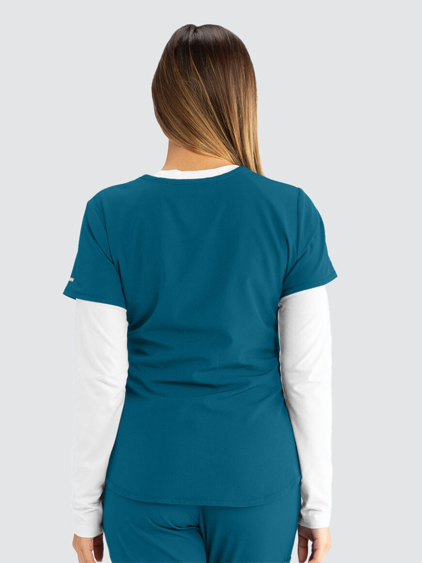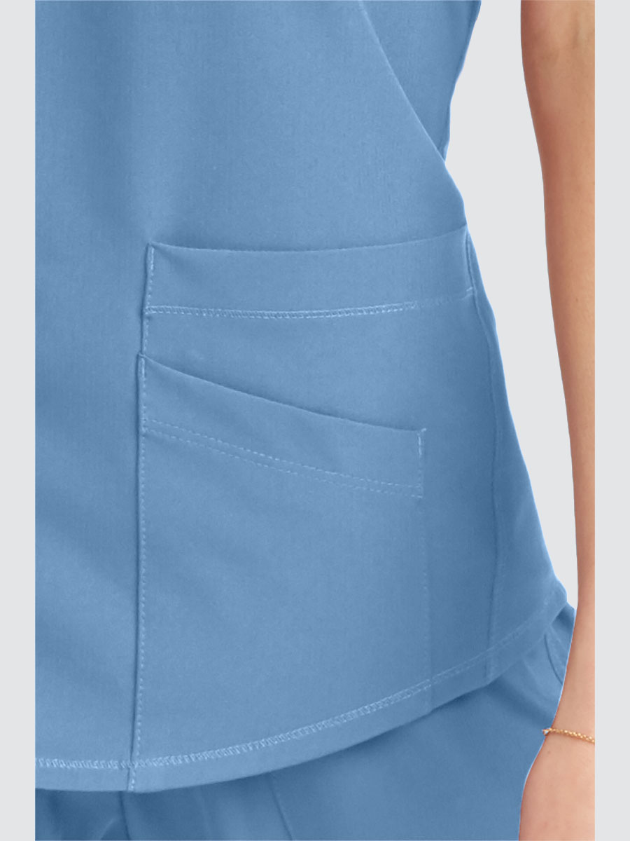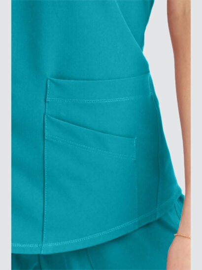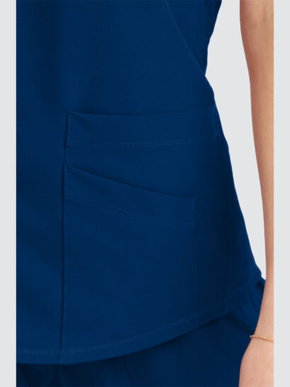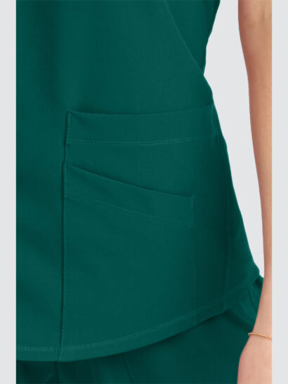 Female virtual V-neck, 3 pocket tunic top with shaped hem and contrast back neck binding.