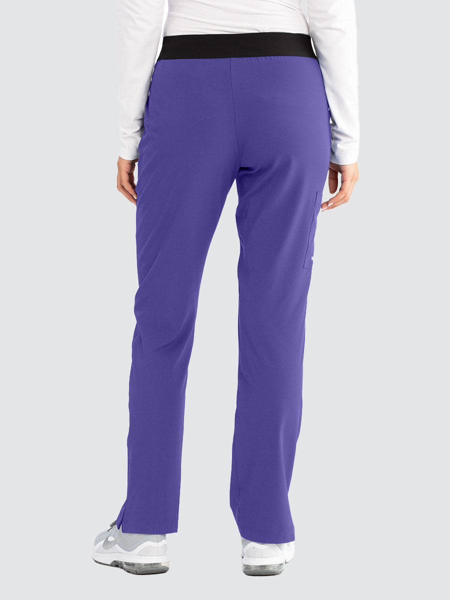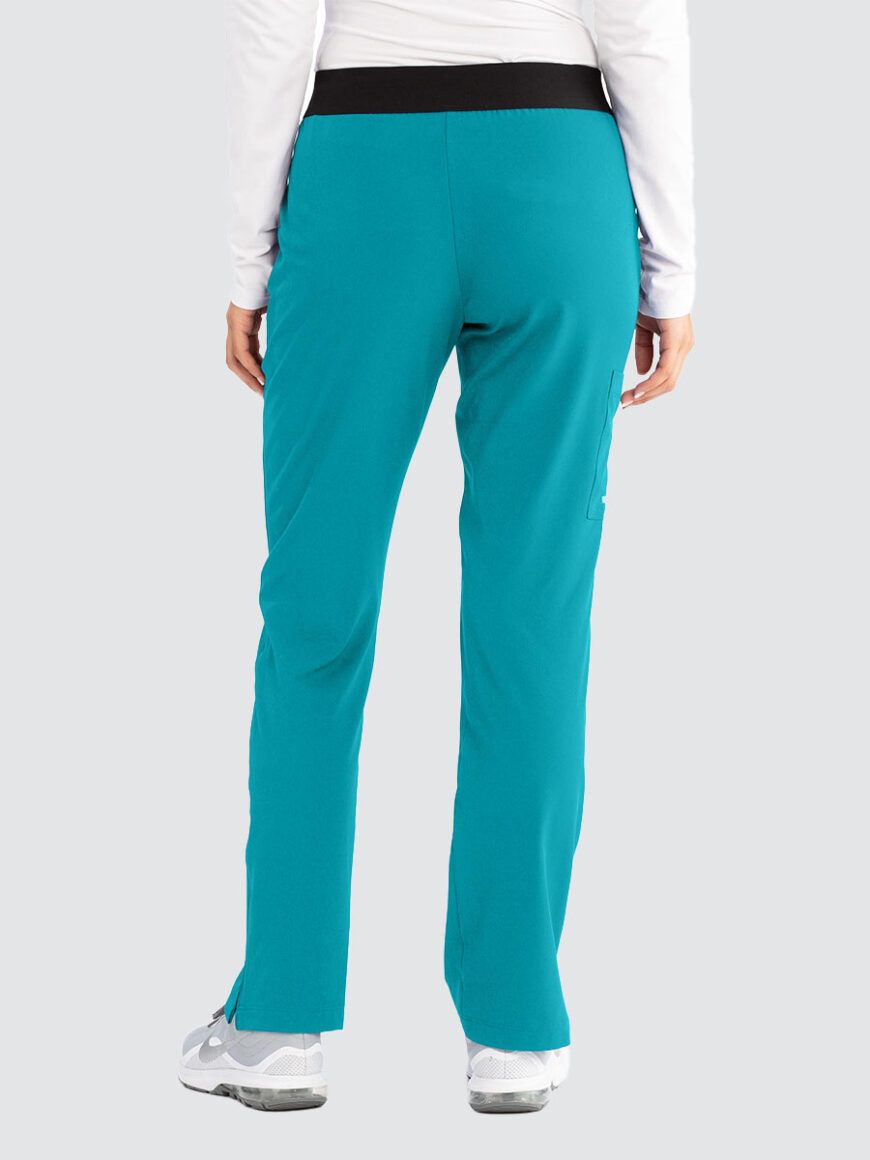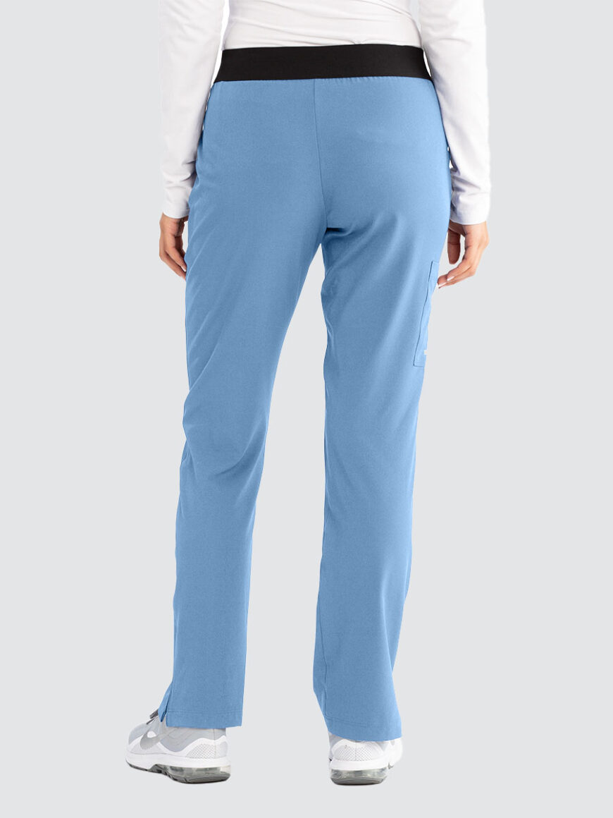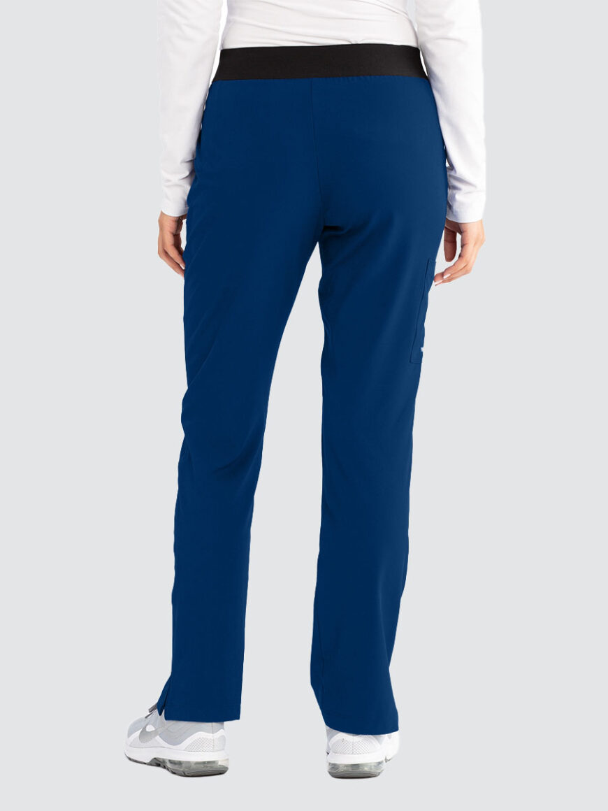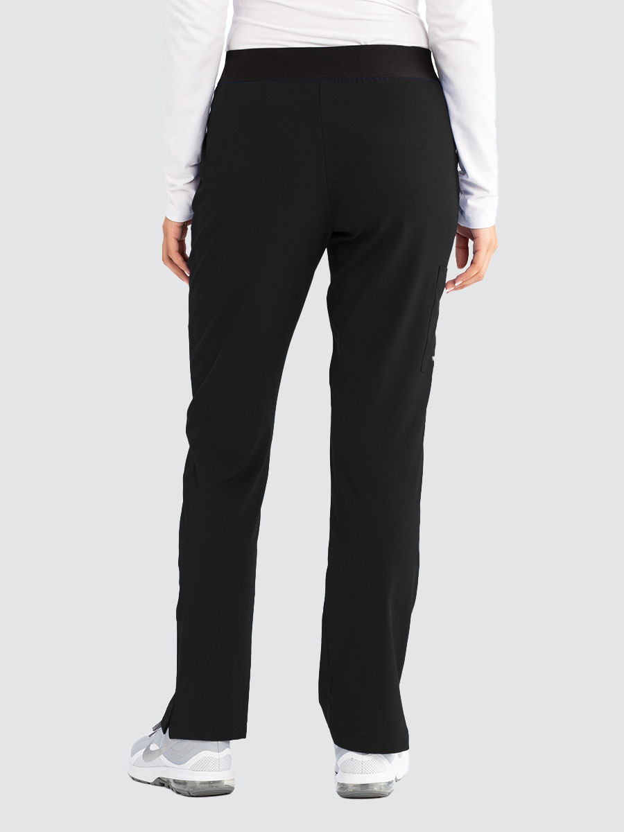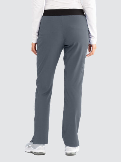 Female mid rise, straight leg elasticated pull-on plush knit waistband with logo. 3 pockets including cargo pocket.