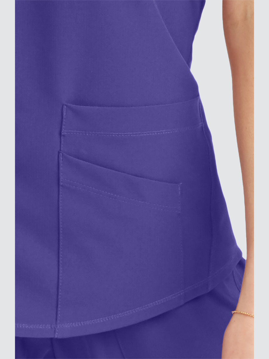 Includes female virtual V-neck, 3 pocket tunic top with shaped hem and contrast back neck binding alongdside mid rise, straight leg elasticated pull-on plush knit waistband with logo. 3 pockets including cargo pocket.